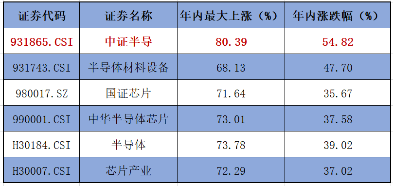 从重仓股来看,中证半导重点布局中微公司、北方华创、寒武纪、中芯国际、海光信息等产业龙头,前十大集中度近8成。Wind数据显示,截至12月19日,该指数2025年年内涨幅54.82%,区间最大上涨超80%,在中证全指半导体、中华半导体芯片、国证芯片等主流半导体指数中位列第一。