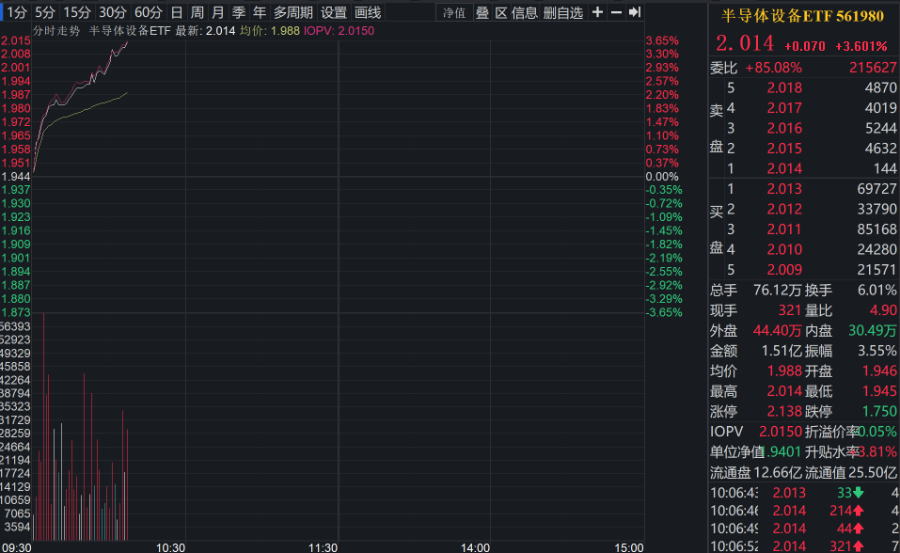 12月22日,三大指数集体高开,芯片产业链多股拉升,存储和上游半导体设备板块表现活跃。截至发稿,半导体设备ETF(561980)高开拉涨3.60%,成交额迅速突破1.5亿元;成分股珂玛科技封涨停板,京仪装备涨超10%,上海新阳、长川科技、联动科技、中科飞测、立昂微等多股涨超8%。