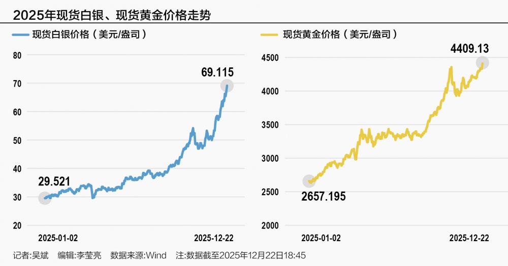 贵金属的疯狂行情仍在继续。12月22日,现货黄金突破4400美元/盎司,现货白银突破69美元/盎司,双双创下历史新高,现货铂金自2008年以来首次升破2000美元/盎司。