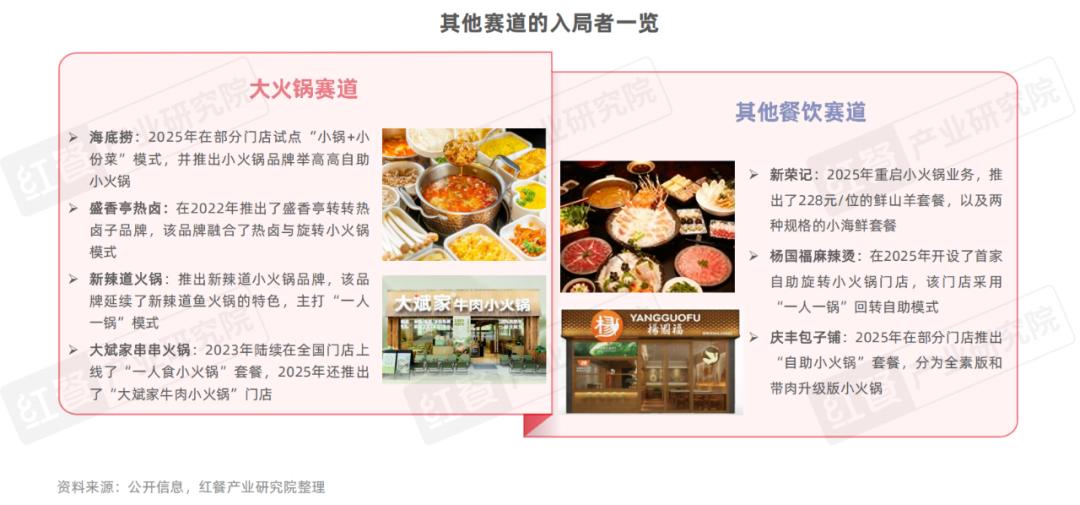 例如,大火锅赛道中,海底捞推出了“小锅+小份菜”产品,还孵化了沸派·甄鲜小火锅子品牌和收购了举高高自助小火锅品牌;中式正餐赛道中,新荣记在2025年重启小火锅业务;麻辣烫赛道中,杨国福麻辣烫开设了首家自助旋转小火锅门店。