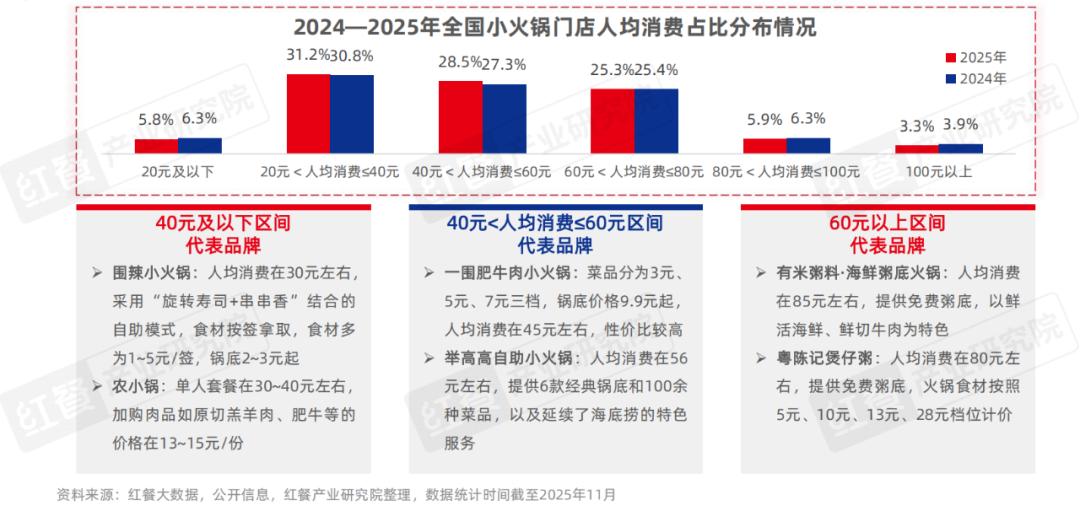 红餐大数据显示,位于20元<人均消费≤40元区间的门店数占比为31.2%,如围辣小火锅、农小锅等品牌的人均消费均位于此区间,通过自助模式或低价套餐满足消费者追求性价比的需求。