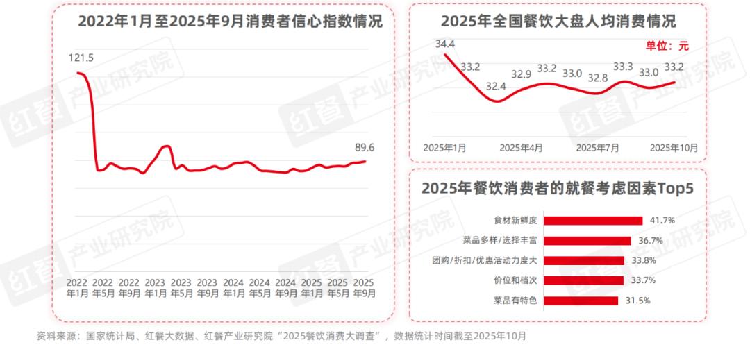 其一,消费者追求性价比的趋势是推动小火锅快速发展的重要因素。在2025年,全国餐饮大盘的人均消费经历了波动式下降,从2025年1月的34.4元下降至2025年10月的33.2元。