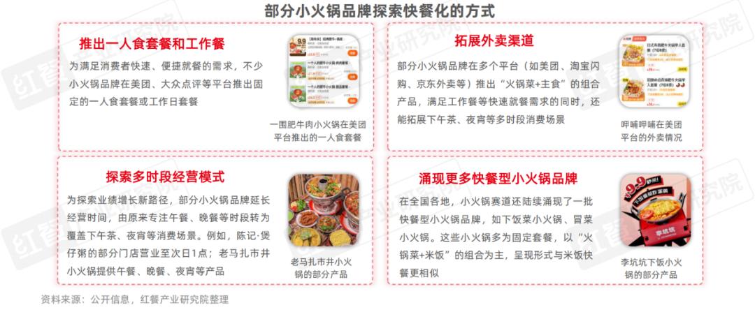 一直以来,快餐化是小火锅核心特征之一。近年来,小火锅品牌主要通过推出一人食套餐和工作餐、拓展外卖渠道、探索多时段经营模式等方式,进一步探索快餐化。