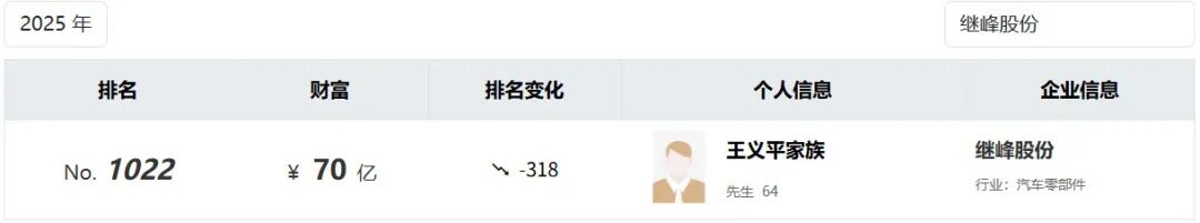 在2025年的胡润百富榜上,王义平家族以70亿元的身家,继续留在榜上。