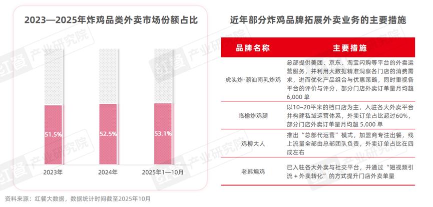 据 红餐大数据 ,2023年以来,炸鸡品类的外卖市场份额占比一直超过50%,且有增长的趋 势,2025年1—10月全国炸鸡门店的外卖市场份额占比达到了53.1%,较2023年提升了1.6个百分点。