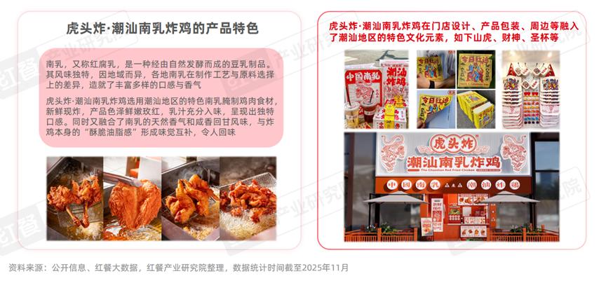 除了将炸鸡产品改良成更符合本土饮食偏好的中式风味外,市场上还涌现了一批专注于地域特色风味的炸鸡品牌,虎头炸·潮汕南乳炸鸡便是其中颇有代表性的品牌 。