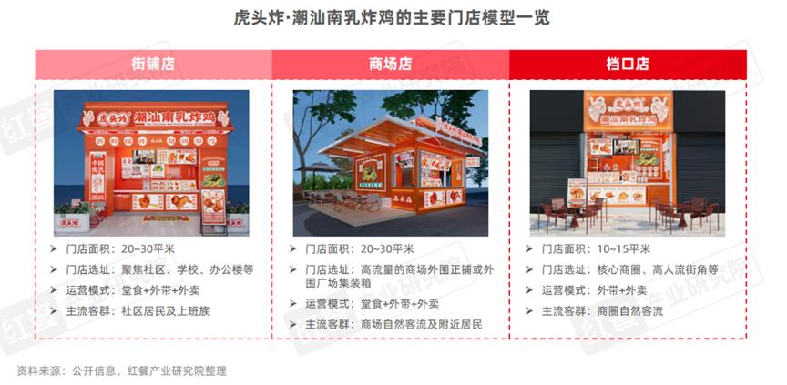 小店型意味着投资小,易复制,试错成本较低。比如虎头炸·潮汕南乳炸鸡,其在广东地区有近10种不同模式的店型,从商场店、外围集装箱店、街铺店到景区流量店、学校店到办公社区店,所有店型都是小型门店,灵活适配各类选址需求, 单店最低投资门槛可降至12万元左右。