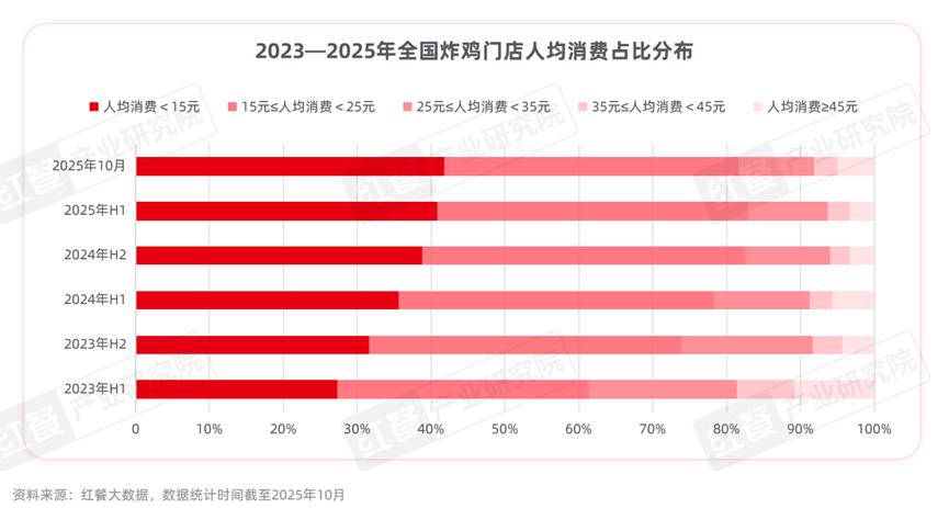 另外,在餐饮市场竞争日益激烈的背景下,炸鸡品类的人均消费也有所下滑。 红餐大数据显示, 截至2025年10月,全国炸鸡门店的人均消费已降至20元,较2023年年底的22.5元下降了11.1个百分点。