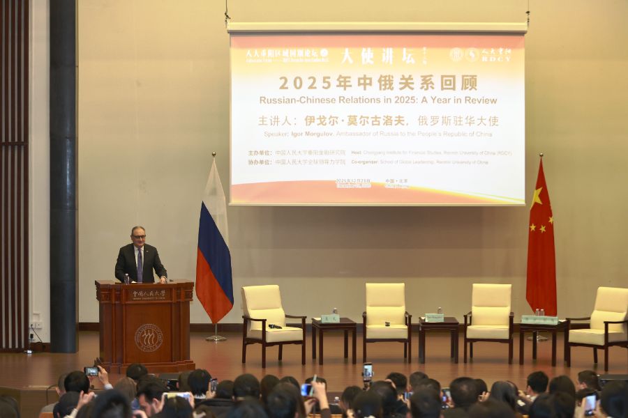 12月23日,俄罗斯驻华大使伊戈尔·莫尔古洛夫做客中国人民大学重阳金融研究院区域国别论坛“大使讲坛”。他在演讲中强调,中俄新时代全面战略协作伙伴关系保持高水平运行,务实合作展现出强大韧性与活力。