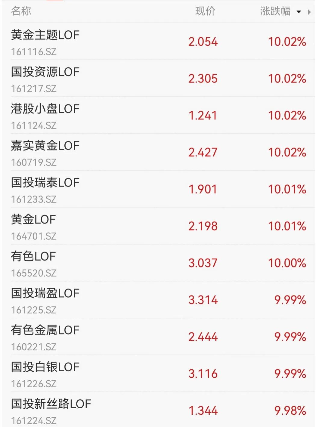 今日场内多只商品LOF产品涨停