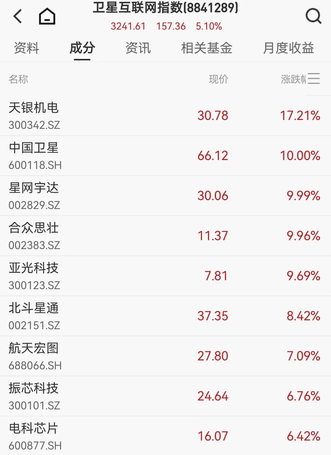 截至收盘,卫星互联网概念指数涨幅超5%。中国卫星、航天动力、新劲刚、超捷股份、新雷能、有研粉材等多股20CM涨停;九鼎新材、天通股份、中超控股等20余股涨停,天银机电涨幅超17%。