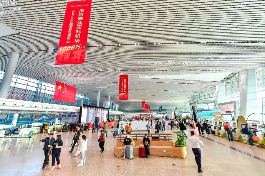 回顾发展历程,近年来,揭阳潮汕机场旅客吞吐量节节攀升:2023年旅客量达718万人次,2024年突破866万人次,增速、增量均位居全国同量级机场前列。2025年揭阳潮汕机场更是一路高歌猛进:春运喜迎“开门红”,单日旅客吞吐量和航班起降架次频频刷新历史纪录,单日旅客量最高达4.1万人次;特别是今年暑运期间火力全开,航班起降14729架次,运送旅客185万人次,同比均增长超16%,创下通航以来同期最佳成绩;11月9日,该机场旅客吞吐量已追平2024年全年水平。