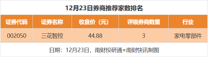 从券商推荐家数来看,12月23日有22家上市公司得到券商推荐,其中三花智控获得3家推荐,华联控股、红旗连锁等获得1家推荐。