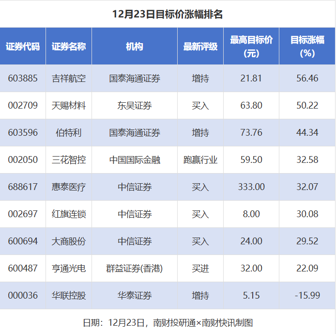 南财投研通数据显示,12月23日,券商给予上市公司目标价共9次,按最新收盘价计算,目标价涨幅排名居前的公司有吉祥航空、天赐材料、伯特利,目标价涨幅分别为56.46%、50.22%、44.34%,分别属于航空机场、电池、汽车零部件行业。