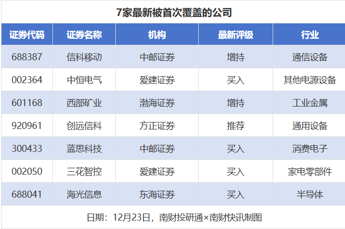 首次覆盖方面,12月23日券商共给出了7次首次覆盖,其中信科移动、蓝思科技获得中邮证券分别给予“增持”“买入”评级,中恒电气获得爱建证券给予“买入”评级,西部矿业获得渤海证券给予“增持”评级,创远信科获得方正证券给予“推荐”评级。