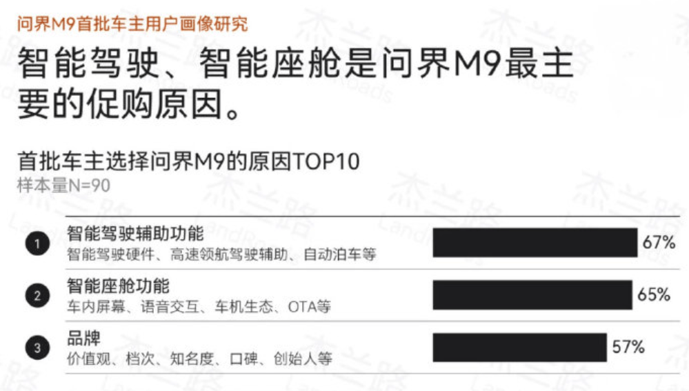 去年调研机构杰兰路对问界M9首批90名车主进行了一场调查,在问到选择问界M9的原因时,华为智能驾驶功能排名第一,有67%的车主选择此项。排名第二的理由是智能座舱,当然也是华为的HarmonyOS 4。