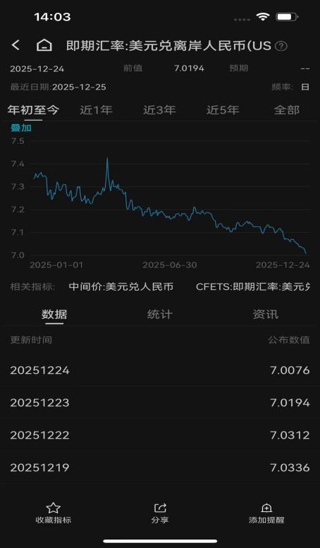 时隔近15个月,离岸人民币对美元汇率首次升破“7”这一重要整数关口。统计显示,今年以来,离岸人民币兑美元汇率累计升值超过了4.5%。在岸市场上,人民币兑美元即期汇率也逼近“7”关口,年内累计升值4%。12月24日,央行发布消息称,中国人民银行货币政策委员会2025年第四季度例会研究了下阶段货币政策主要思路。会议指出,要增强外汇市场韧性,稳定市场预期,防范汇率超调风险,保持人民币汇率在合理均衡水平上的基本稳定。