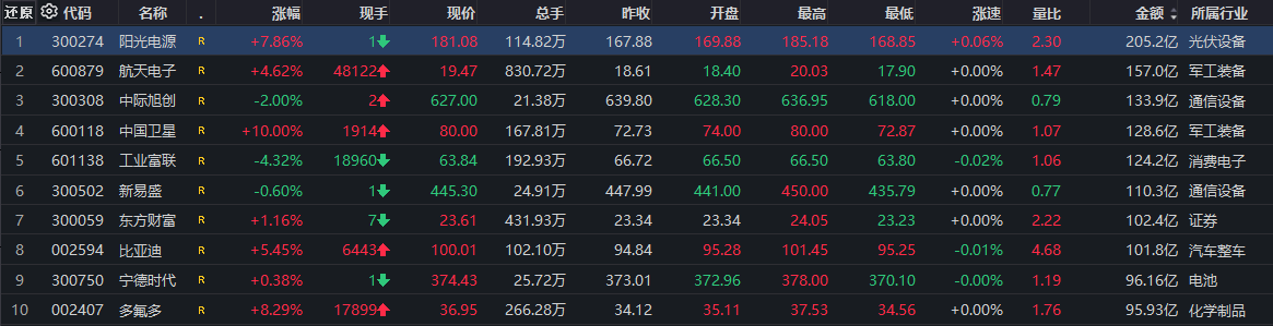 个股方面,阳光电源成交额破200亿元居首,航天电子、中际旭创、中国卫星等成交额靠前。