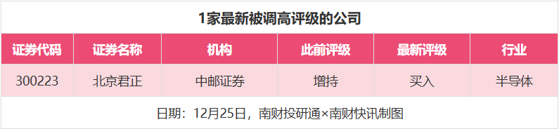 评级调高方面,12月25日,券商调高上市公司评级达到1家次,中邮证券对北京君正的评级从“增持”调高至“买入”。