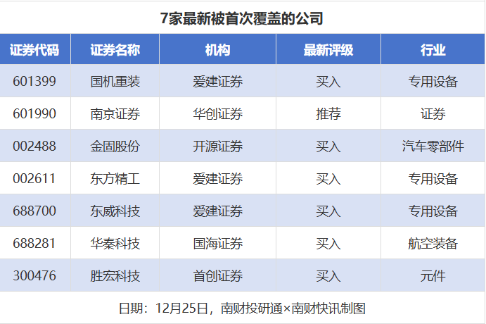 首次覆盖方面,12月25日券商共给出了7次首次覆盖,其中国机重装、东方精工、东威科技均获得爱建证券给予“买入”评级,南京证券获得华创证券给予“推荐”评级,金固股份获得开源证券给予“买入”评级。