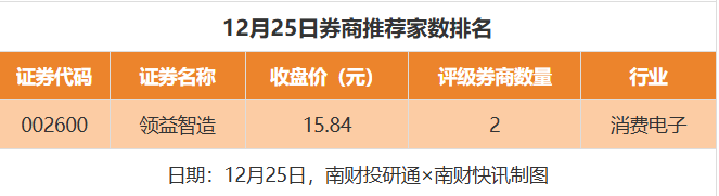 从券商推荐家数来看,12月25日有20家上市公司得到券商推荐,其中领益智造获得2家推荐,国机重装、南京证券等获得1家推荐。
