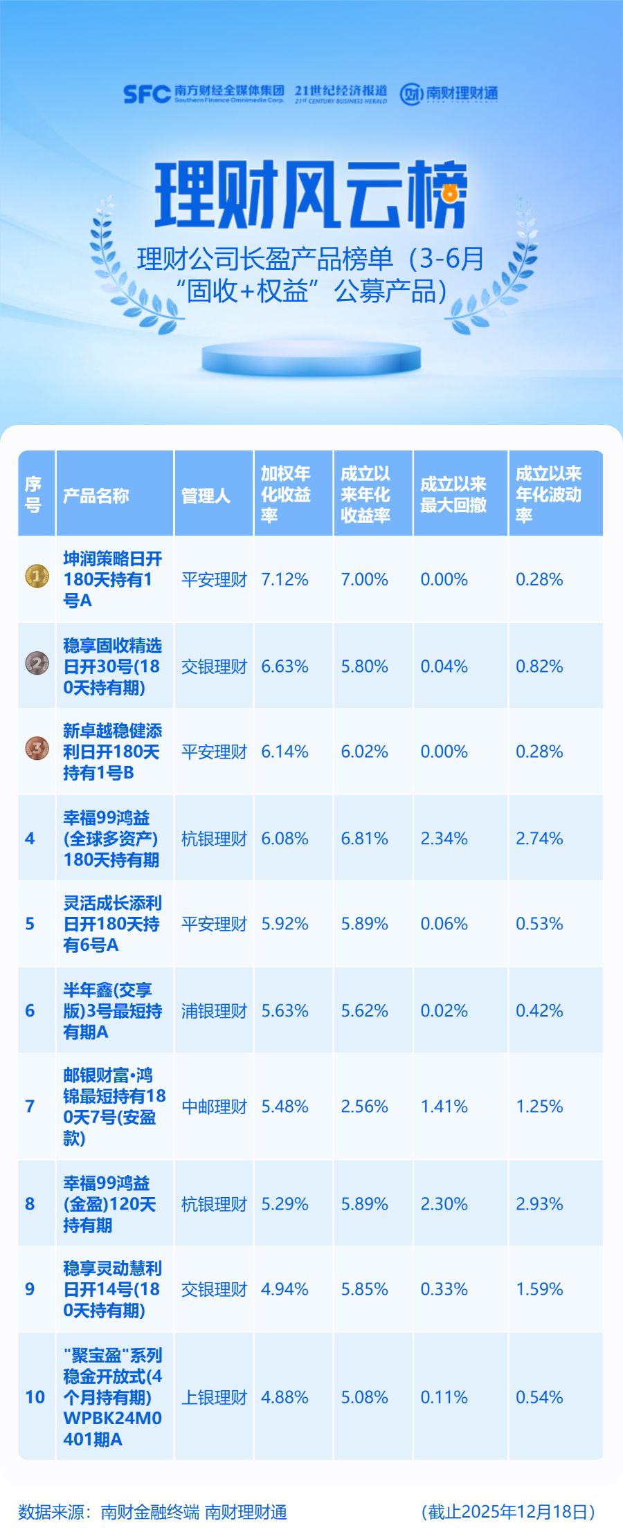 榜单数据说明:统计对象为理财公司发行的成立满1年的投资周期在3—6月(含)的公募固收+权益产品,同系列同投资周期产品保留一只,加权平均收益率计算方式为“5%近1月年化收益率+10%近3月年化收益率+15%近6月年化收益率+30%近1年年化收益率+40%成立以来年化收益率”,排名依据为加权年化收益率,数据计算截止时间为2025年12月18日。榜单排名由理财通AI全自动化实时排名,如您对数据有疑问,请在文末联系助理进一步核实。