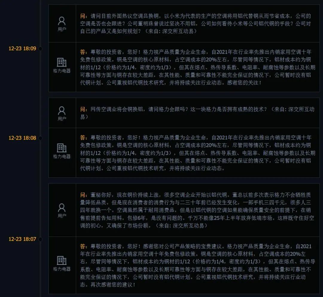 12月23日,格力电器在互动平台表示,铜是空调的核心原材料,占空调成本的20%左右,尽管同等情况下,铝材成本约为铜材的1/12(价格约为1/4,密度约为1/3),但其在熔点、热传导系数、电阻率、耐腐蚀等参数以及长期可靠性等方面与铜存在较大差距,在其性能、质量和可靠性不能完全保证的情况下,公司暂时没有铝代铜计划。