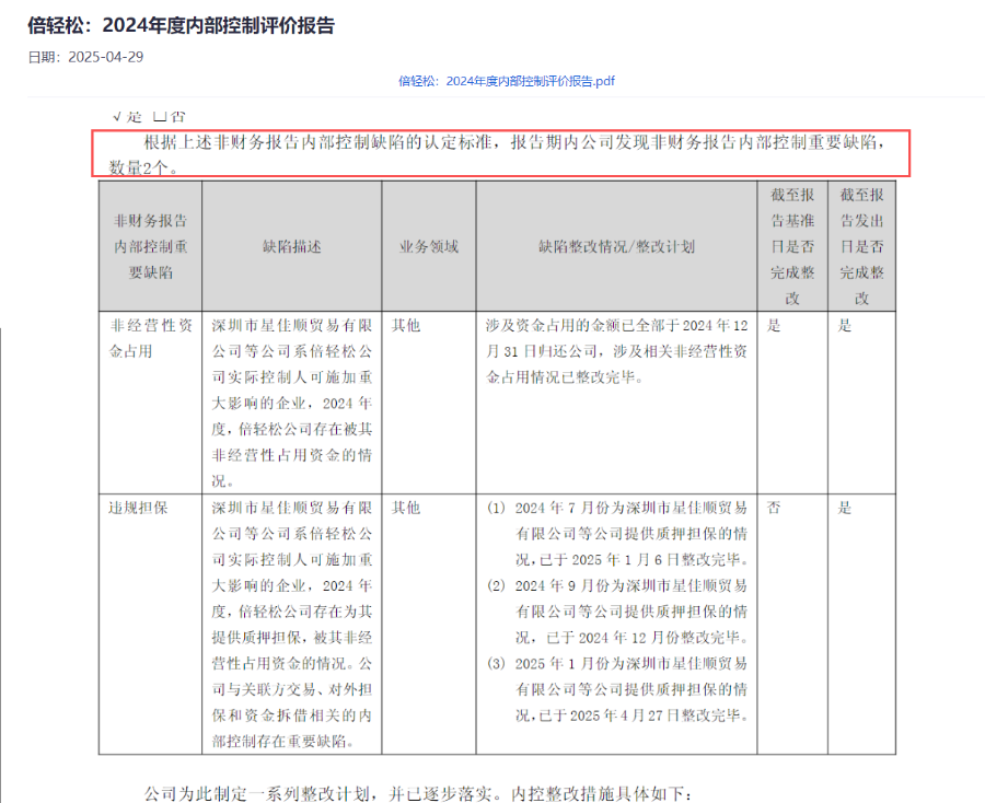 违规担保方面,深圳市星佳顺贸易有限公司等公司系倍轻松公司实际控制人可施加重大影响的企业,2024年度,倍轻松公司存在为其提供质押担保,被其非经营性占用资金的情况。公司与关联方交易、对外担保和资金拆借相关的内部控制存在重要缺陷。