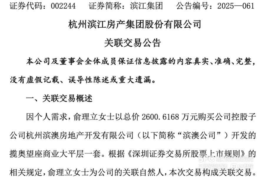 12月26日,滨江集团(002244.SZ)公告,因个人需求,公司董事长戚金兴之配偶俞理立以总价2600.6168万元,购入集团控股子公司滨澳公司开发的揽奥望座商业大平层一套,构成关联交易。