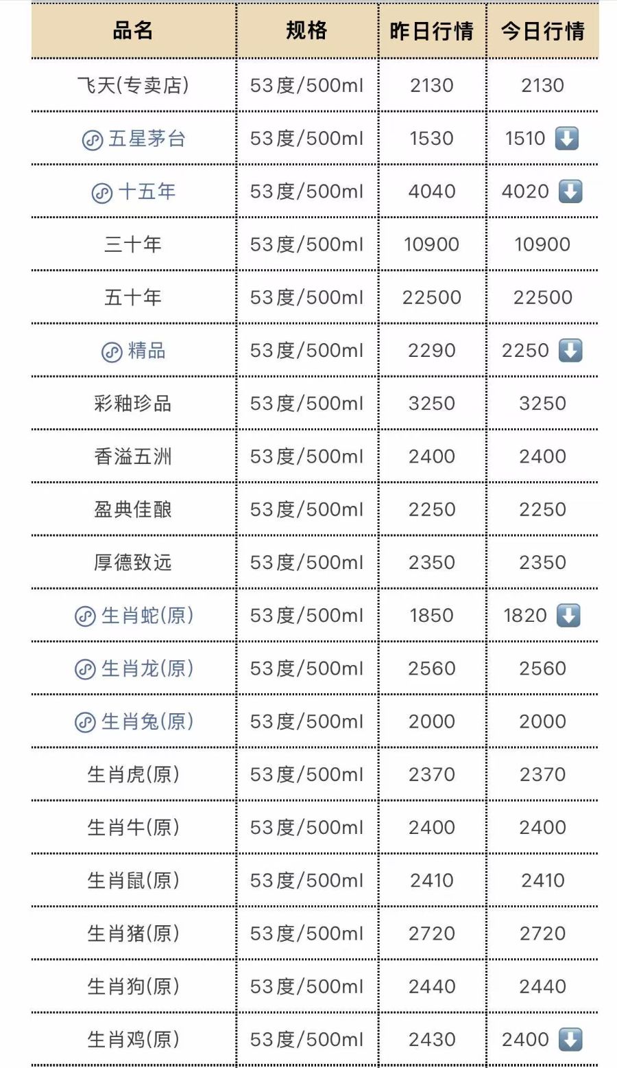 此外,公斤茅台(53度/1L)原箱批发参考价报3050元/瓶,较上一日跌20元;散花飞天报2400元/瓶,较上一日跌100元;五星茅台批发参考价报1510元/瓶,较上一日跌20元;十五年报4020元/瓶,较上一日跌20元;精品报2250元/瓶,较上一日跌40元;生肖蛇原箱报1820元/瓶,较上一日跌30元;生肖鸡原箱报2400元/瓶,较上一日跌30元;其中,生肖蛇原箱较12月24日时的2000元/瓶回落了9%。