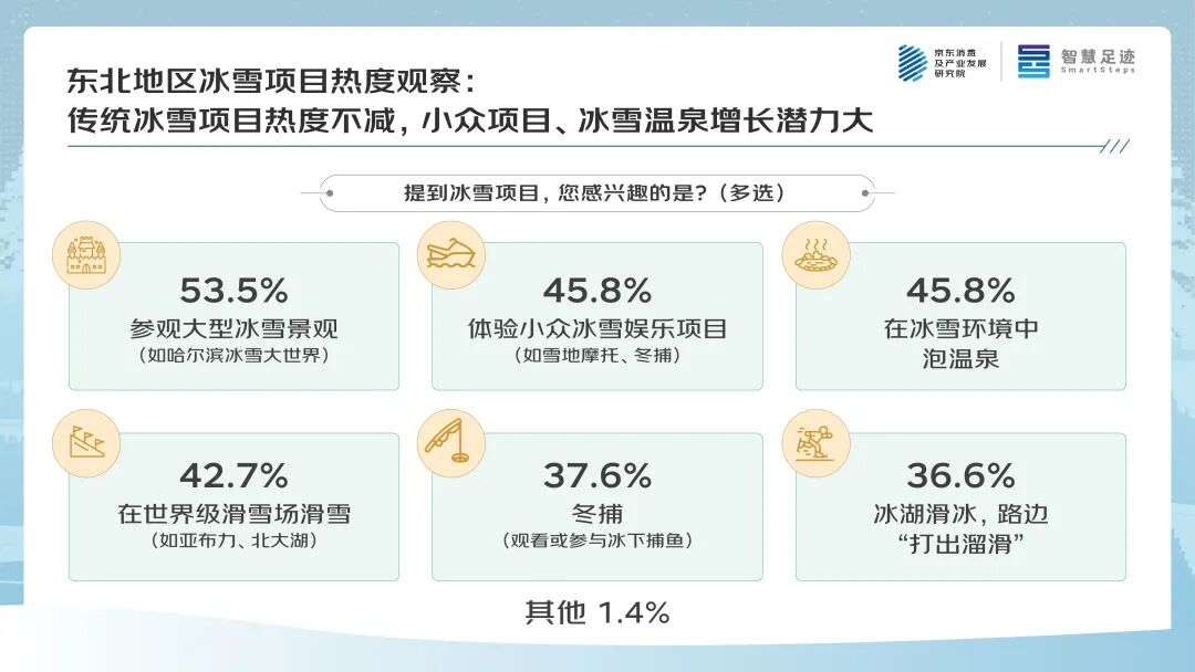 游客乐于前往东北“看雪”、“滑雪”,却不止于此,多元化与沉浸式“玩雪”成为新趋势,游客对冰雪项目的兴趣大大提升。京东调研数据显示,参观大型冰雪景观(如哈尔滨冰雪大世界)以53.5%的占比成为最受欢迎的冰雪项目,其“冰雕艺术+文旅融合”的模式适合全年龄段,既能满足游客“必看”的打卡心理,又适宜家庭游、团队游的普适性需求,形成了客流的基本盘,品牌效应显著。紧随其后的是体验小众冰雪娱乐项目(雪地摩托、冬捕)和在冰雪环境中泡温泉,两者均占比45.8%。部分游客开始追求个性化、冒险性或疗愈性的深度参与,渴望在标准行程之外获得独特记忆点,这种“观光+互动+疗愈”的组合,满足了这部分游客追求新奇、社交分享与深度放松的复合需求。