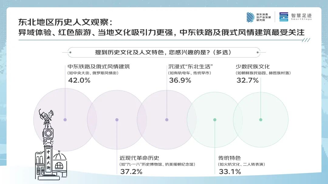 京东调研显示,游客对东北历史文化表现出广泛兴趣。中东铁路及俄式风情建筑(中央大街等)以42.0%的关注度位列第一,异域风情的建筑与街区提供了强烈的场景穿越感。近现代革命历史和沉浸式“东北生活”紧随其后,其占比分别为37.2%和36.9%。