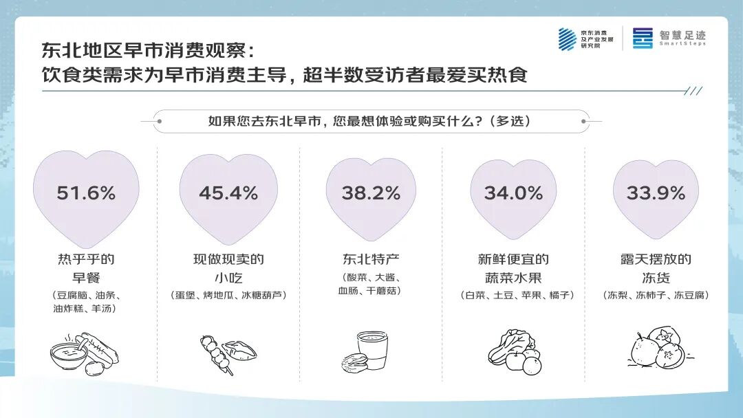 如果说洗浴中心是最本地化的人文场景之一,早市就是最具烟火气的人文场景,也是观察东北生活最生动、最温暖的剖面之一。调研数据显示,赶一次热闹的东北早市成为打动游客的人文场景之一。在42.7%的受访者眼中,早市首先是东北人朴实、热闹、直爽性格的缩影,然后有42.2%、39.5%和39.3%的受访者认为,早市是价格实惠、食材新鲜的“社区冰箱”、一日三餐的起点、传承本地饮食文化与季节食材的窗口,也有38.0%的受访者认为,早市是游客体验“本地人日常”的快速通道。