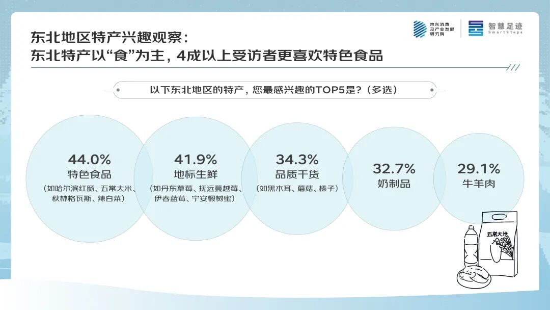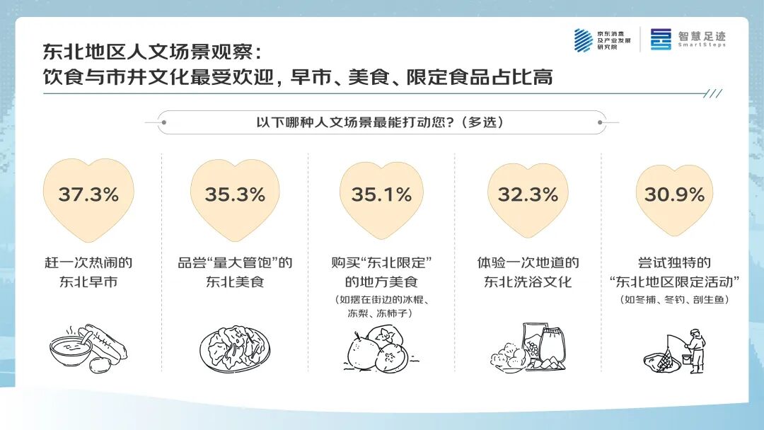 作为东北地域文化的重要组成部分,饮食与市井文化备受欢迎。京东调研显示,逛热闹的早市、品尝量大管饱的美食和购买东北限定的特色食品是最能打动游客的人文场景,票选率分别为37.3%、35.3%和35.1%,大家都对“东北味道”和东北的“生活气”兴趣浓厚。所以,在特产方面也以“吃”最为丰富,特色食品、地标生鲜和品质干货分别以44.0%、41.9%和34.3%的票选率成为受访者最感兴趣的特产。