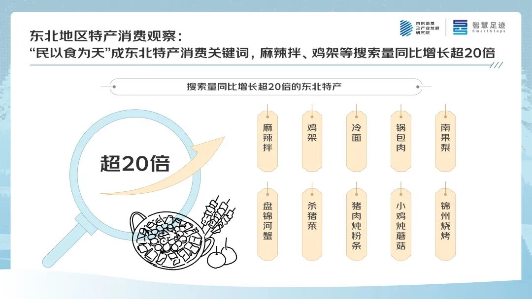 京东消费数据也再度佐证了东北美食的热度:近一个月,“麻辣拌、鸡架、锅包肉”等特色小吃的搜索量同比增长超20倍;“五常大米、丹东草莓、哈尔滨红肠”等产品的搜索量同比增长超10倍。游客奔东北“诗意冰雪”而去,携“美味鲜香”而归。