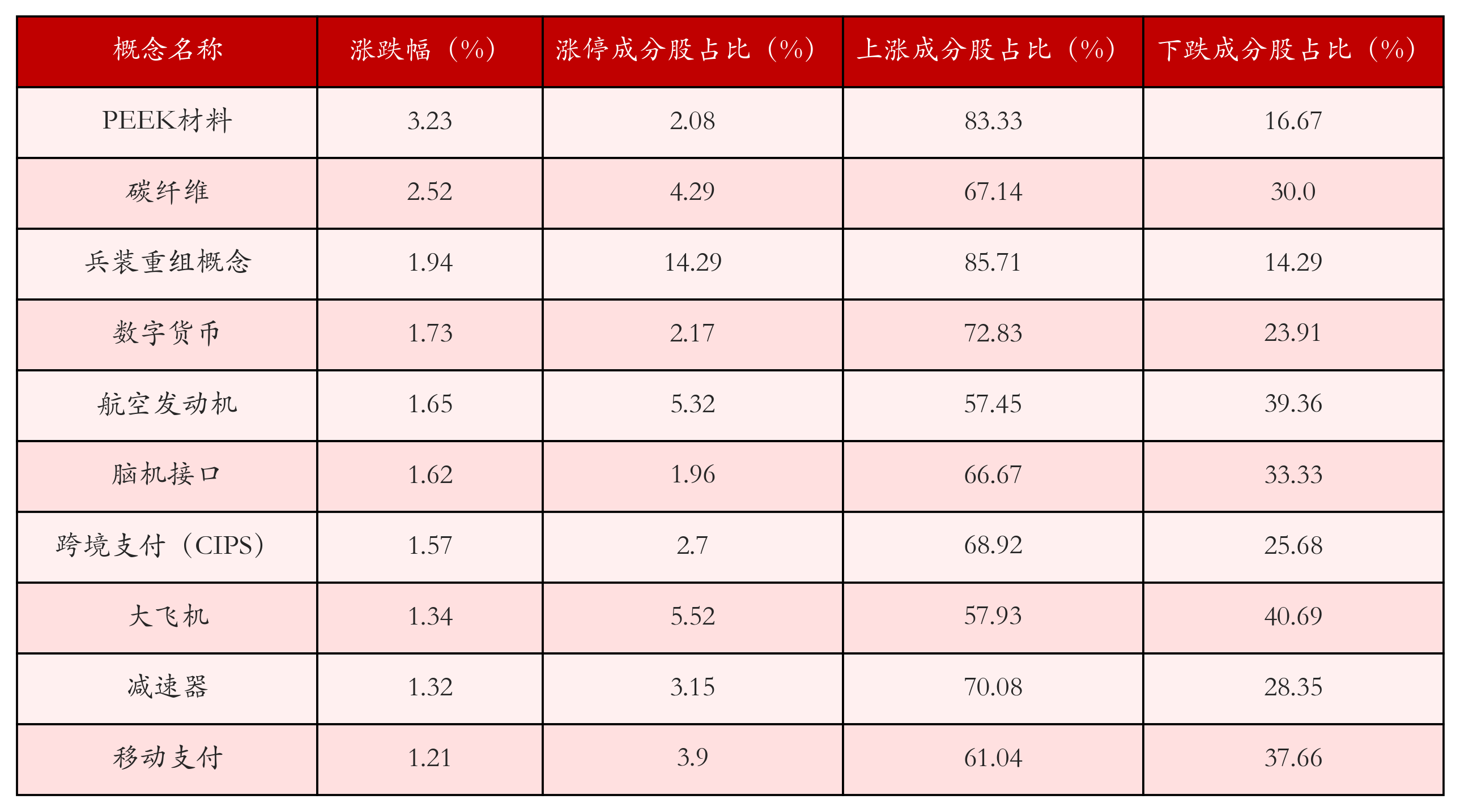 根据A股概念涨跌幅与所对应的股票池综合分析,涨幅靠前的三个概念板块分别为:PEEK材料、碳纤维与兵装重组概念。排名前10位的概念板块相关数据见下表: