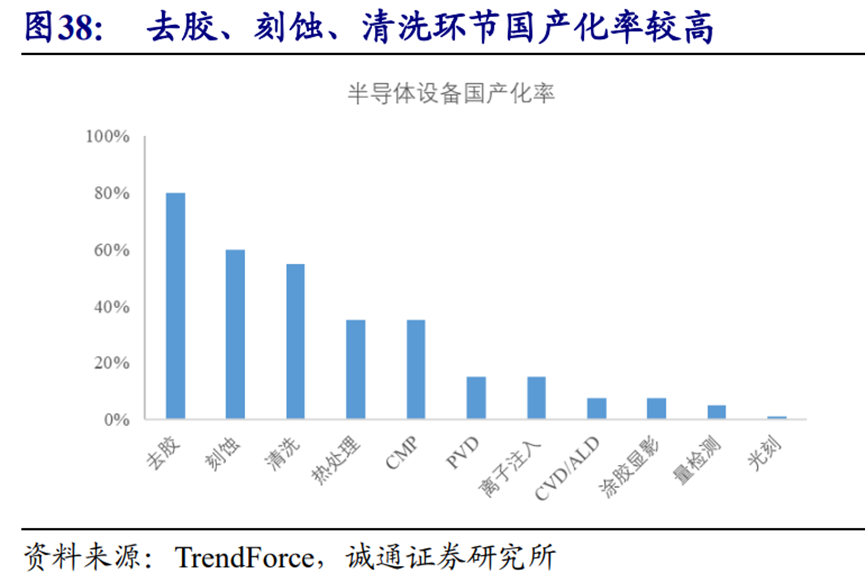 诚通证券指出,近年来国内半导体设备行业工艺覆盖度及市场占有率不断提升。根据 TrendForce 数据,去胶、刻蚀、清洗等环节国产化率已超过 50%,龙头公司有望持续提升份额;热处理、CMP 等环节国产化率达 30%-50%,正迎来快速突破的成长机遇;量检测、光刻等国产化率低于 10%的核心高端环节,国产化空间较大。