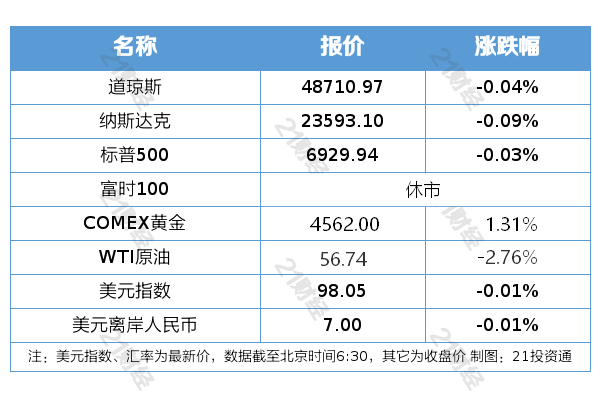 纽约股市三大股指12月26日下跌。截至当天收盘,道琼斯工业平均指数比前一交易日下跌20.19点,收于48710.97点,跌幅为0.04%;标准普尔500种股票指数下跌2.11点,收于6929.94点,跌幅为0.03%;纳斯达克综合指数下跌20.21点,收于23593.10点,跌幅为0.09%。