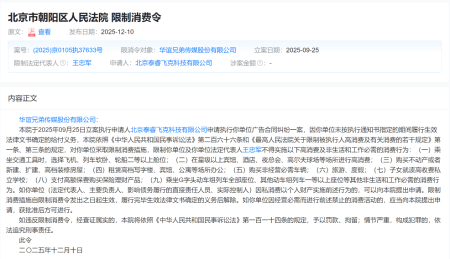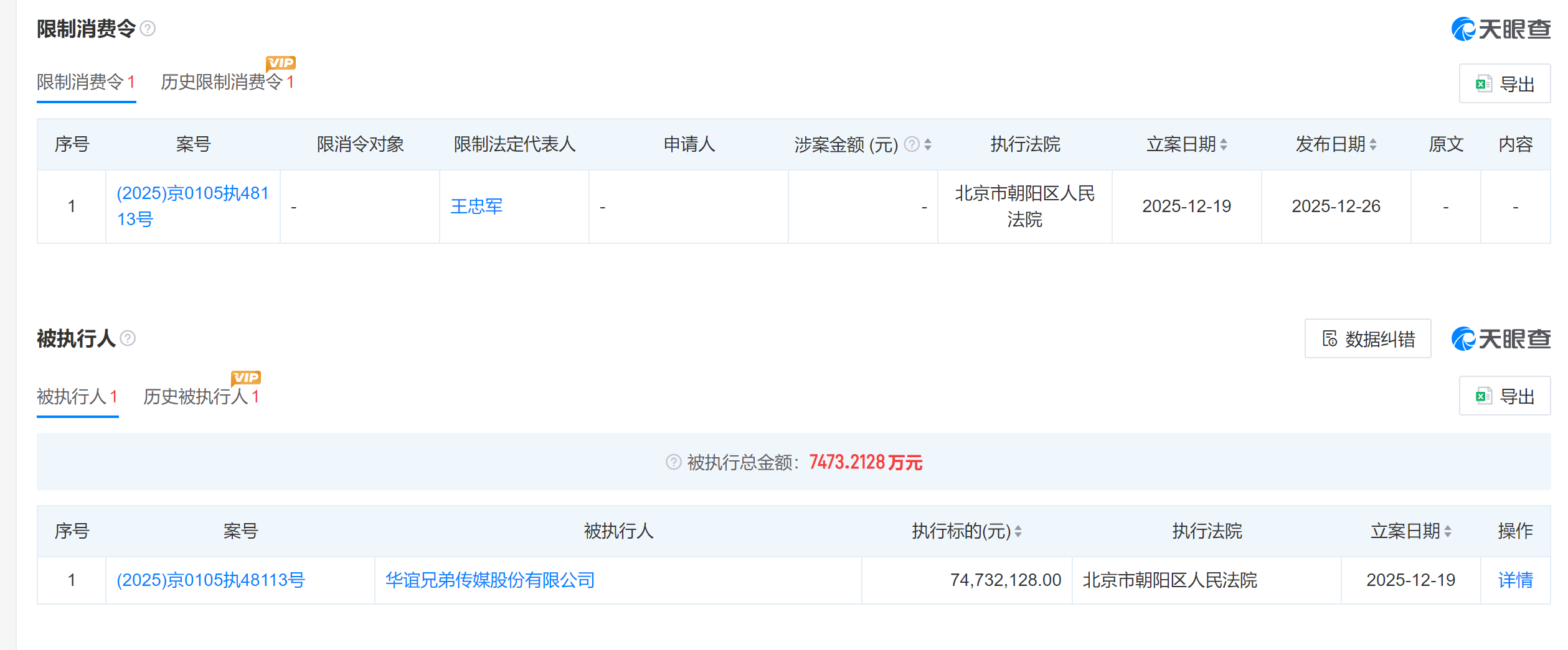 据天眼查官网显示,近日华谊兄弟旗下两家核心公司华谊兄弟电影有限公司、华谊兄弟传媒股份有限公司及其法定代表人王忠磊、王忠军被北京市朝阳区人民法院限制高消费,涉及7473万元执行案件。