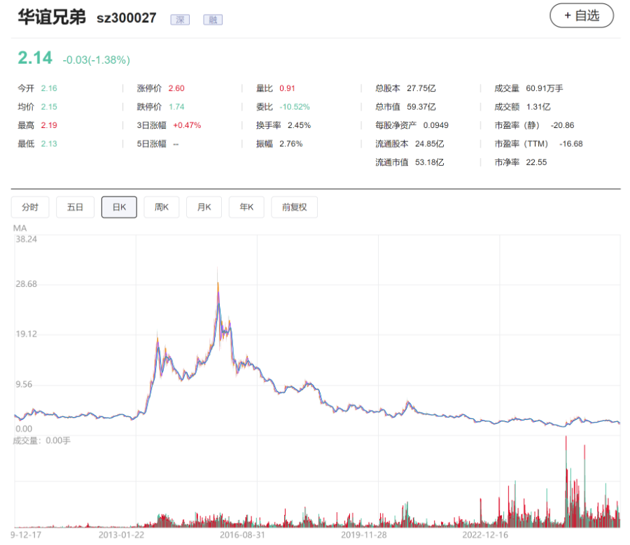 资本市场表现方面,华谊兄弟股价也是一路下跌。截至12月29日收盘,公司股价报收2.14元/股,总市值仅59.37亿元,较2015年股价巅峰时期的近900亿元总市值缩水超90%。