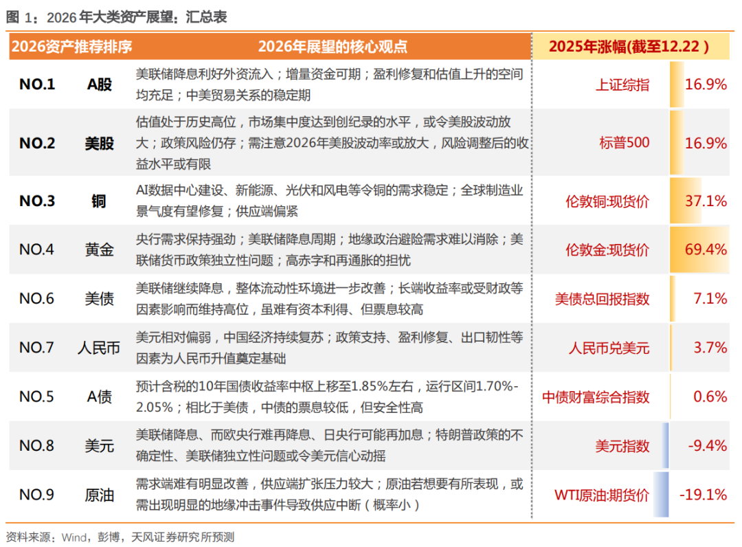 展望2026年,我们对主要资产的排序:A股>美股>铜>黄金>美债(包含票息)>人民币>中债>美元>原油。