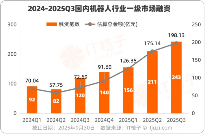 据IT桔子统计,2025年前三季度,国内机器人行业融资事件达到了610笔,较去年同期翻倍增长。进入下半年以来,融资事件更呈现加速增长的态势,仅第三季度就有243笔。