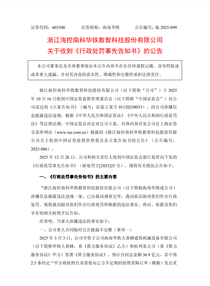 2025年12月27日,浙江海控南科华铁数智科技股份有限公司(海南华铁,证券代码:603300)披露公告称,公司及时任核心高管收到中国证券监督管理委员会浙江监管局《行政处罚事先告知书》,因36.9亿元算力服务合同相关信息披露存在违规行为,公司拟被罚800万元,相关责任人合计拟被罚920万元。此次处罚为这场历时近一年的算力跨界合作闹剧画上阶段性句号,也为上市公司跨界新兴赛道的信息披露规范敲响警钟。