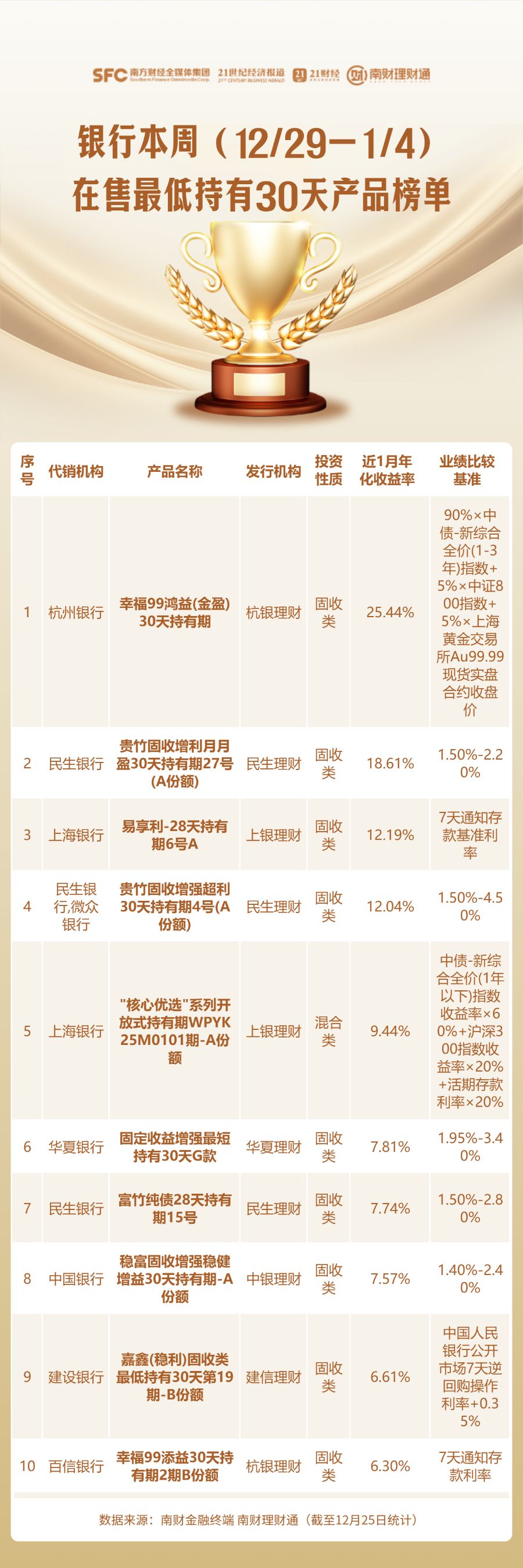 需要特别提醒的是:本榜单对理财产品“在售”状态的判断基于其投资周期推算。但实际情况中,部分产品可能因额度售罄,或银行针对不同客户展示的产品清单存在差异而无法购买。因此,建议投资者以代销银行APP的实际展示为准。