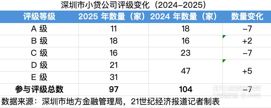 相较2024年的评级结果,深圳2025年参与评级的小贷公司整体减少7家,其中A级减少7家,B级增加2家,C级减少8家,D级E级合计增加5家。