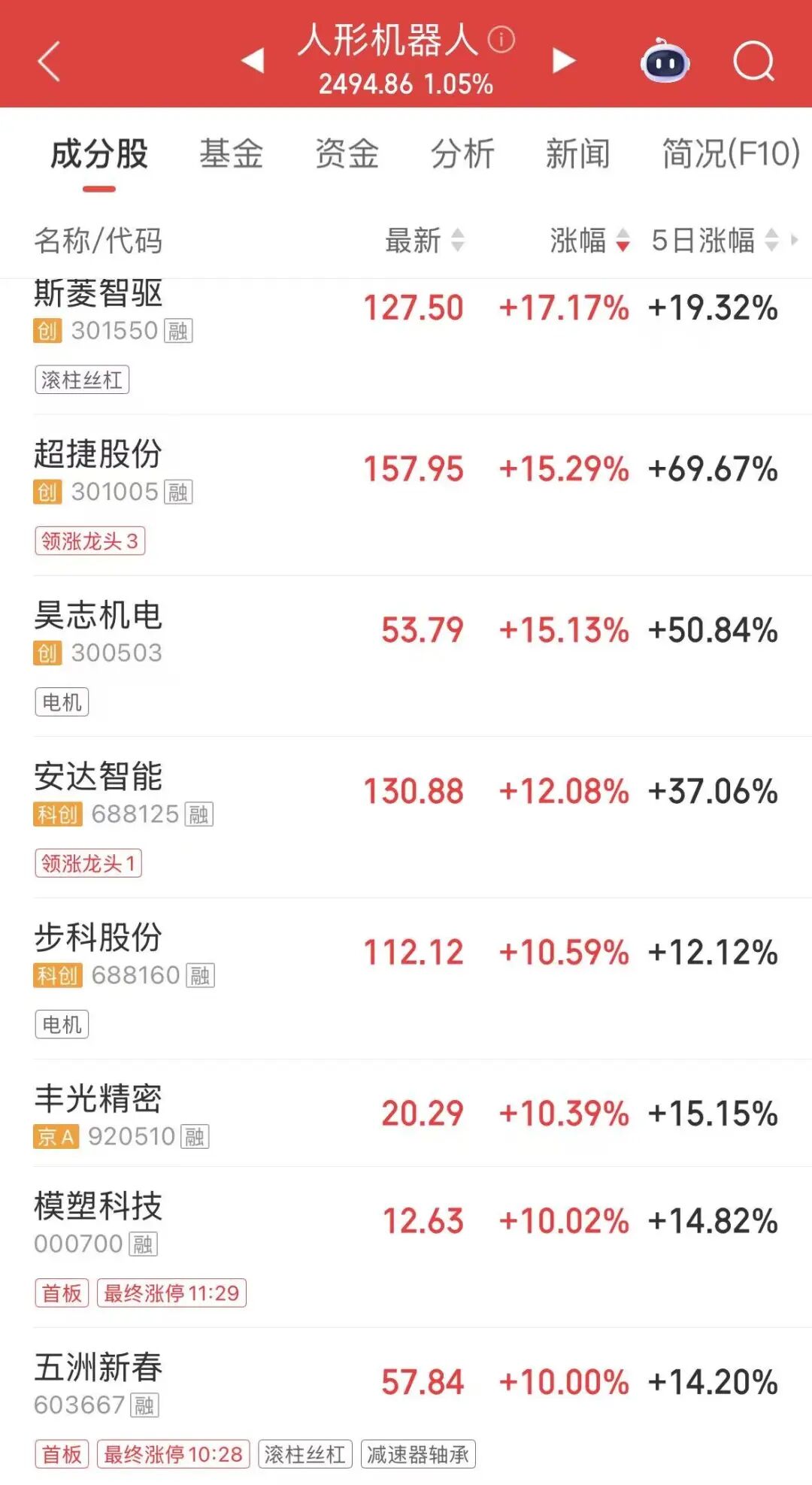人形机器人概念拉升,锋龙股份4连板,模塑科技、五洲新春、大业股份、骏亚科技涨停,上纬新材涨超18%,昊志机电、超捷股份涨超15%。