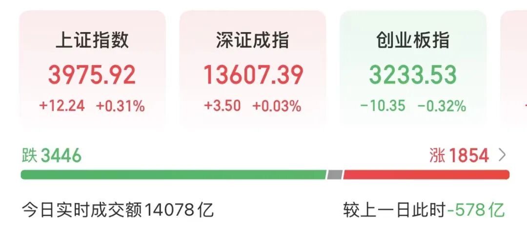 12月29日,早盘A股三大指数涨跌不一,创业板指翻红后再度回落,截至午间收盘,沪指涨0.31%,深成指涨0.03%,创业板指跌0.32%。沪深两市半日成交额1.4万亿,较上个交易日缩量578亿,全市场超3400只个股下跌。