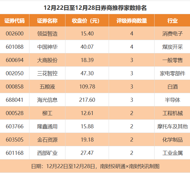 从券商推荐家数来看,12月22日至12月28日有177家上市公司得到券商推荐,其中领益智造、中国神华获得4家推荐,大商股份等获得3家推荐。