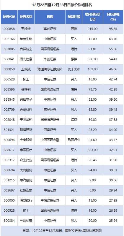 南财投研通数据显示,12月22日至12月28日,券商给予上市公司目标价共49次,按最新收盘价计算,目标价涨幅排名居前的公司有五粮液、莱茵生物、吉祥航空,目标价涨幅分别为95.85%、63.76%、55.56%,分别属于白酒、化学制品、航空机场行业。