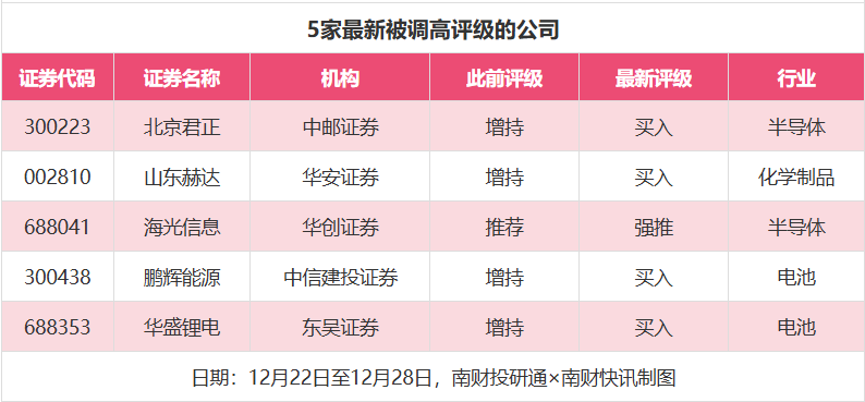 评级调高方面,12月22日至12月28日,券商调高上市公司评级达到5家次,最新数据包括了中邮证券对北京君正的评级从“增持”调高至“买入”,华安证券对山东赫达的评级从“增持”调高至“买入”,华创证券对海光信息的评级从“推荐”调高至“强推”。